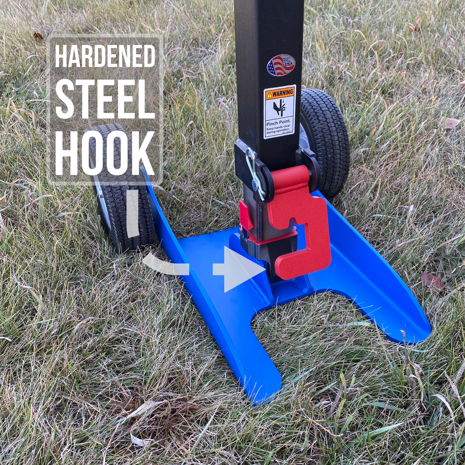 Newly designed 5/8'' hardened steel hook was specifically designed to work with fence t-posts as well as tent stakes.