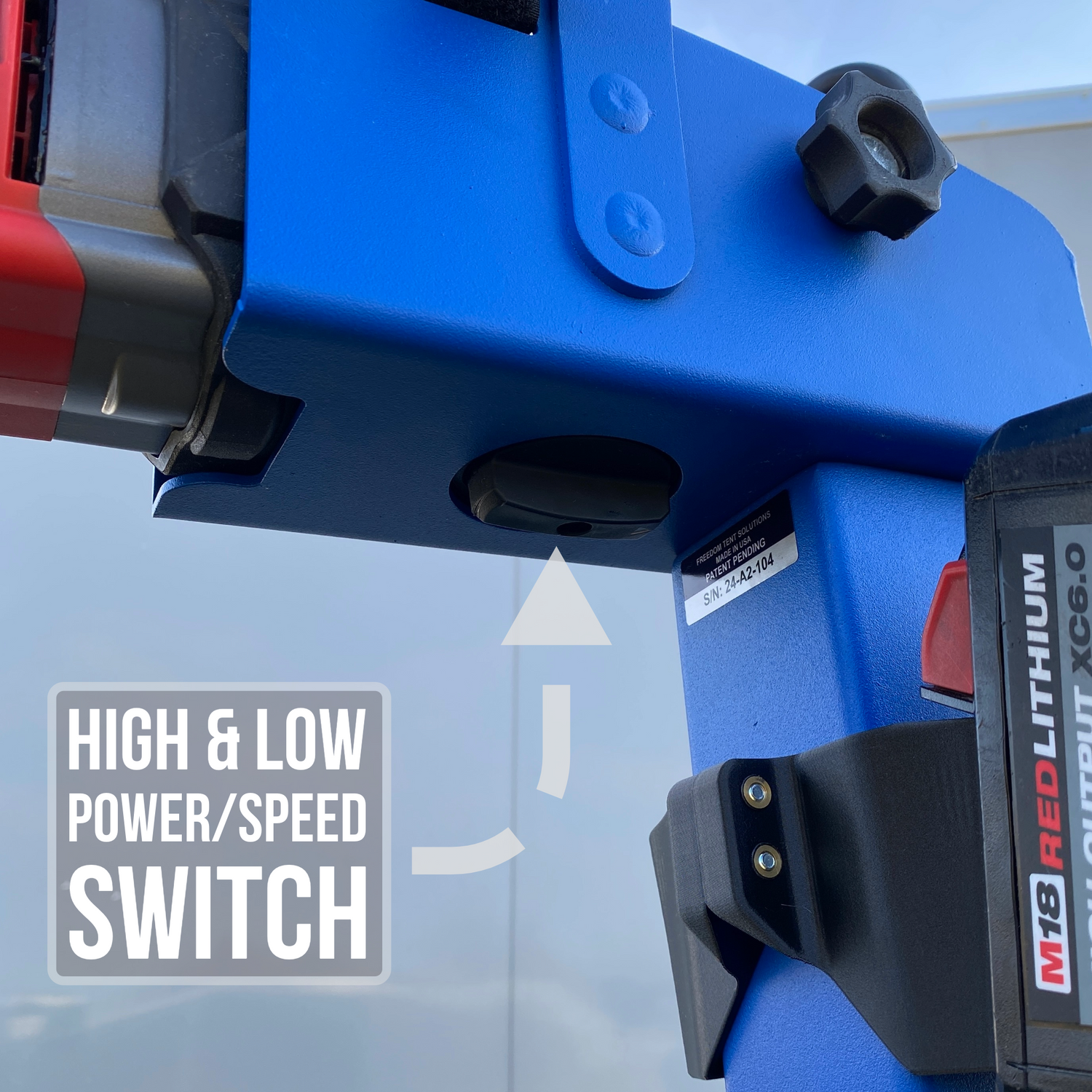 With a turn of this switch you can choose between High Torque Low Speed or Low Torque High Speed. Which setting you choose will depend on how stuck your tent stakes are.